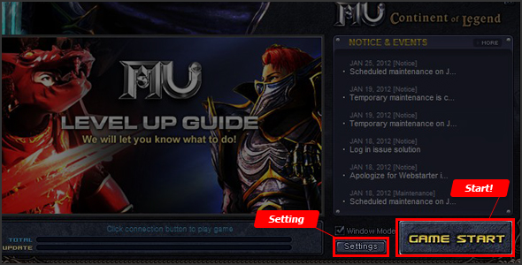 Once you see the game client window, you may configure some of the game. settings (screen resolution, color depth, sound) by pressing on the 'Setting' button, otherwise continue by pressing 'Game Start'